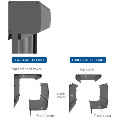 - Pelmet lower lip hides the Top Stop and provides a flush appearance between the Bottom Bar and Pelmet.